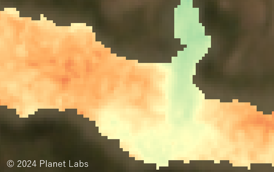 特定外来生物であるオオキンケイギクが、河川敷のいつ、どこに、生えている可能性があるのか、河川の下流から中流にかけての生育分布を衛星画像を用いて可視化しました。