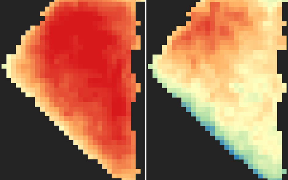 稲の高温障害(特に開花期の高温による籾の不稔)が、どこで、どの程度発生している可能性があるのか、とある市内の水田を対象に、衛星画像を用いて可視化しました。